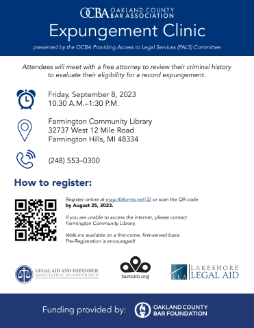 Register for a free expungement clinic presented by the Oakland County Bar Association Providing Access to Legal Services (PALS) Committee. Attendees will meet with an attorney to review their criminal history to evaluate their eligibility for a record expungement. Register online at map.tfaforms.net/32 by August 25, 2023.